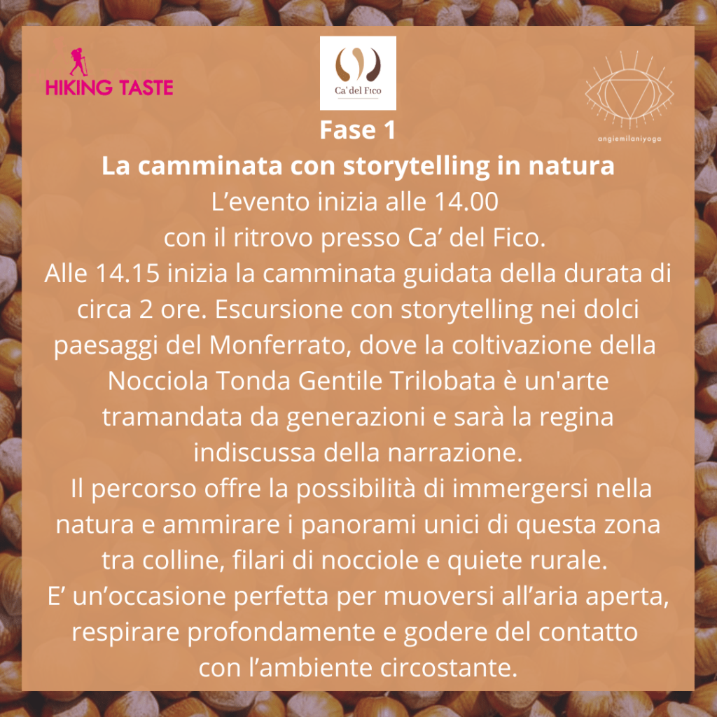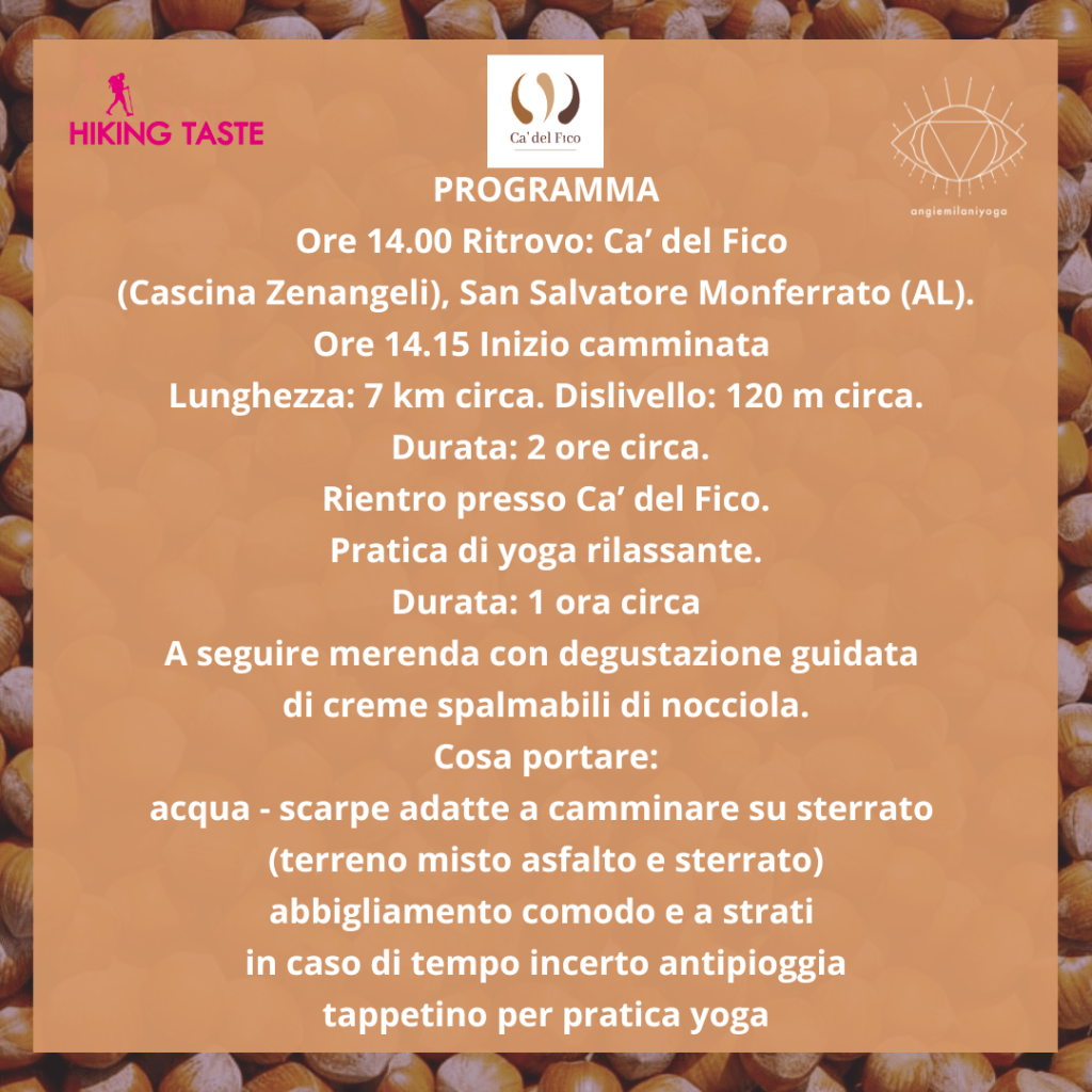 In caso di maltempo (tale da non permettere lo svolgimento del trekking), sarà svolta altra attività indoor legata al mondo del Monferrato e della nocciola.